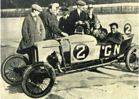 Capt. Archie Frazer-Nash and Ron Godrfrey in a GN racer at Brooklands.